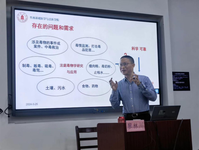廖林川教授以“法医毒物学创新研究的思考及实践”为题,从法医毒物学的发展历程、研究设计、新技术的运用等方面,结合目前团队的研究成果进行了精彩汇报。同时,他以毒品为例,深入介绍了目前法医毒物学在相关检材处理技术、现场快筛手段以及实验室检测等方面的运用,并结合目前国际前沿科学研究介绍了毒品在体内的成瘾及作用机制。