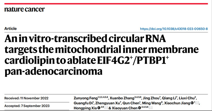 近日,我校第一附属医院神经系统疾病医学转化中心研究团队与新加坡国立大学杨潞龄医学院(NUS Yong Loo Lin School of Medicine)Chen Xiaoyuan Shawn(陈小元)教授团队、东南大学中大医院生命健康高等研究院夏洪平教授团队紧密合作,在《Nature Cancer》发表了题为“An in vitro-transcribed circular RNA targets the mitochondrial inner membrane cardiolipin to ablate EIF4G2+/PTBP1+ pan-adenocarcinoma”研究型论文。第一附属医院神经系统疾病医学转化中心冯遵永博士为论文第一作者,我校第一附属医院为论文第一通讯单位。