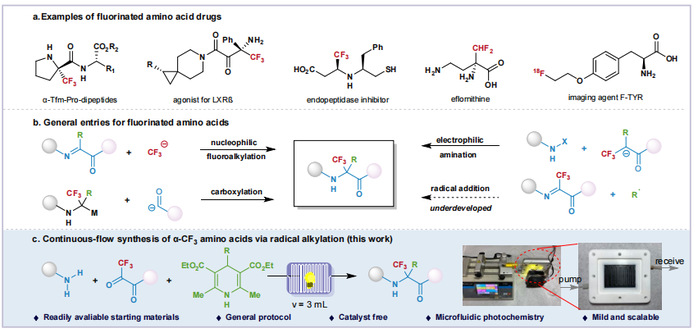 含氟氨基酸是一类非常有价值的修饰后氨基酸,广泛应用于生物科学和制药工业,以提高蛋白质的稳定性、活性和折叠性能。然而,合成方法传统上受到苛刻条件和有限底物范围的限制。该研究工作从廉价的含氟酮酸酯和丰富的伯胺出发,利用各类烷基汉斯酯,在温和的光催化连续流条件下,一步高效合成各类三氟甲基取代的天然氨基酸类似物,大大扩充了结构多样性和底物适用范围,比现有方法的产率高、时间短、易放大,是未来合成含氟氨基酸的理想方法。